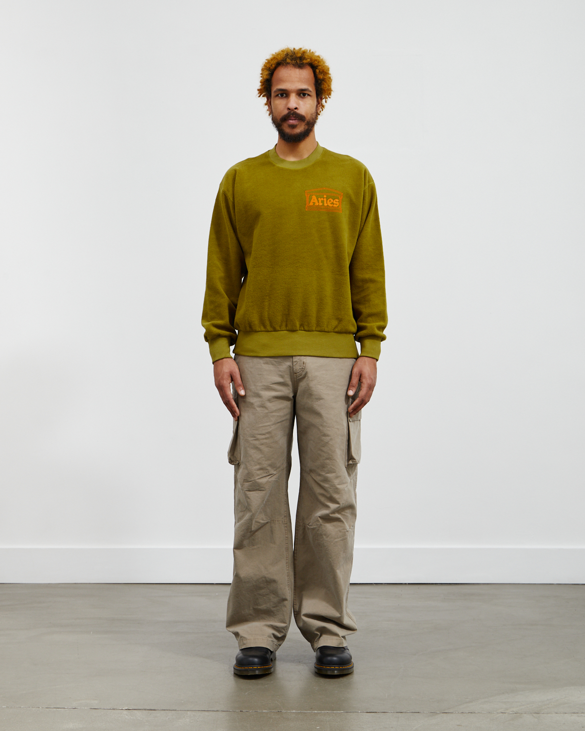 The Reverse Fleece Temple Sweat Olive is a unisex crew-neck sweatshirt by Aries, made from brushed jersey fleece. Brushed-side out, the sweater features a screen-printed Aries temple logo on the chest, with elasticated round neck collar, hems and cuffs. Crafted from 100% cotton. Manufactured in Italy.