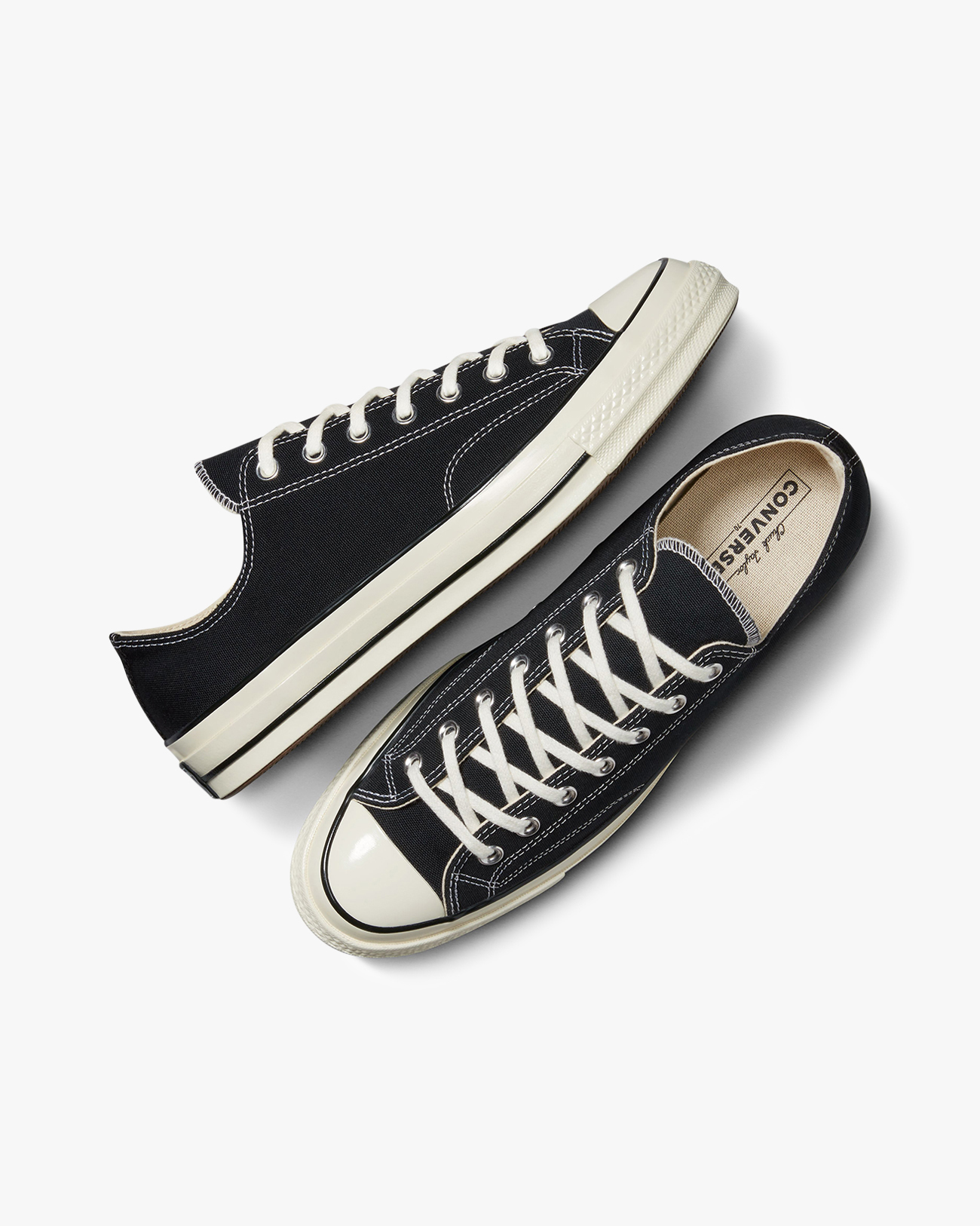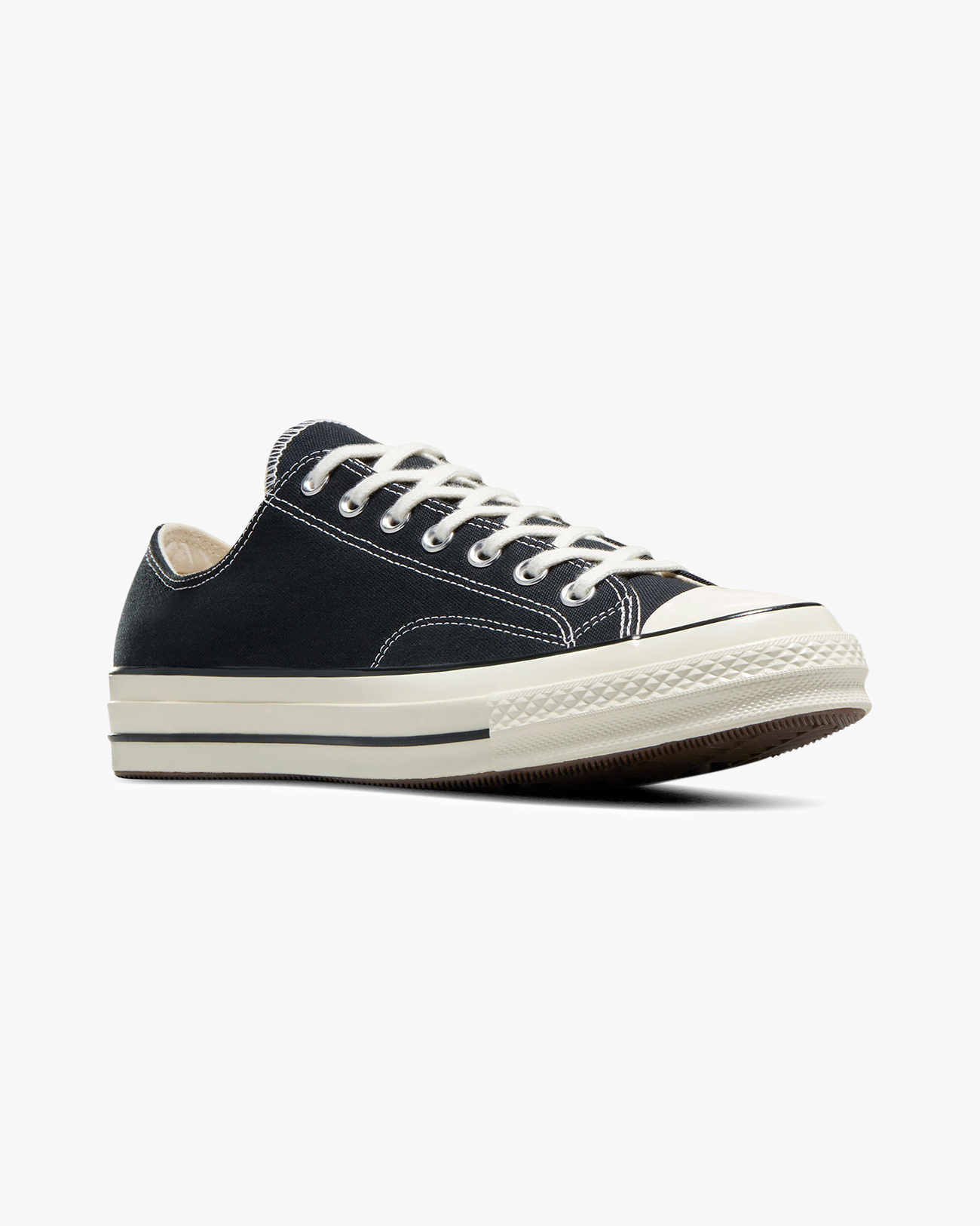 A shoe that needs no introduction, the Converse Chuck Taylor 70 is possibly the most famous canvas shoe, shown here in its original Black colourway in low-top version. Featuring signature detailing including Ortholite cushioning, egret midsole, vintage license plate and extra stitch detail (all exclusive to the 70s Chuck) and winged tongue to hold it in place, it epitomises timelessness. Crafted from premium canvas. Sizing in US, fits true to size. layer of rubber under the quarter panel for added durability. Crafted from hemp. Sizing in US, fits true to size.