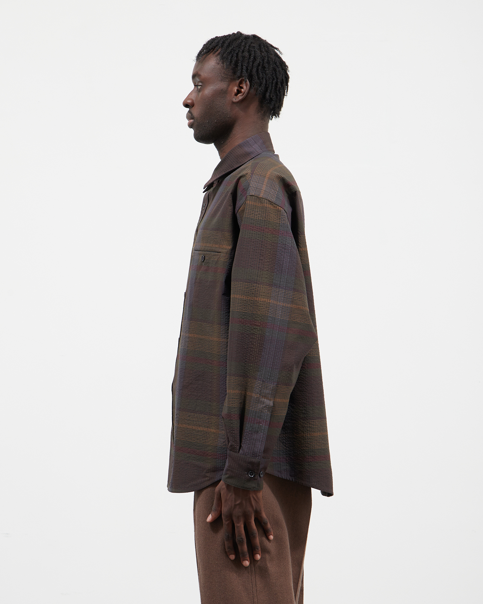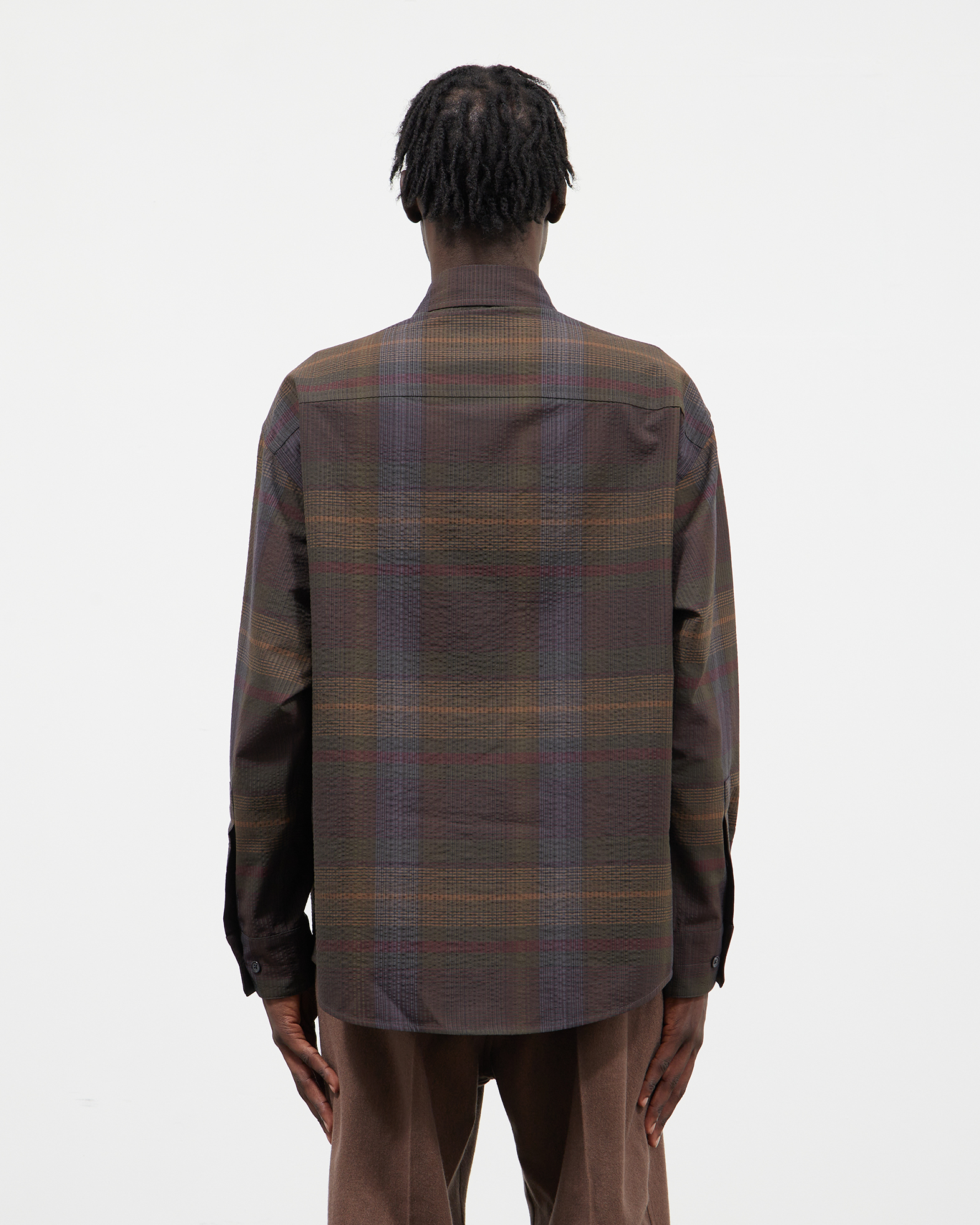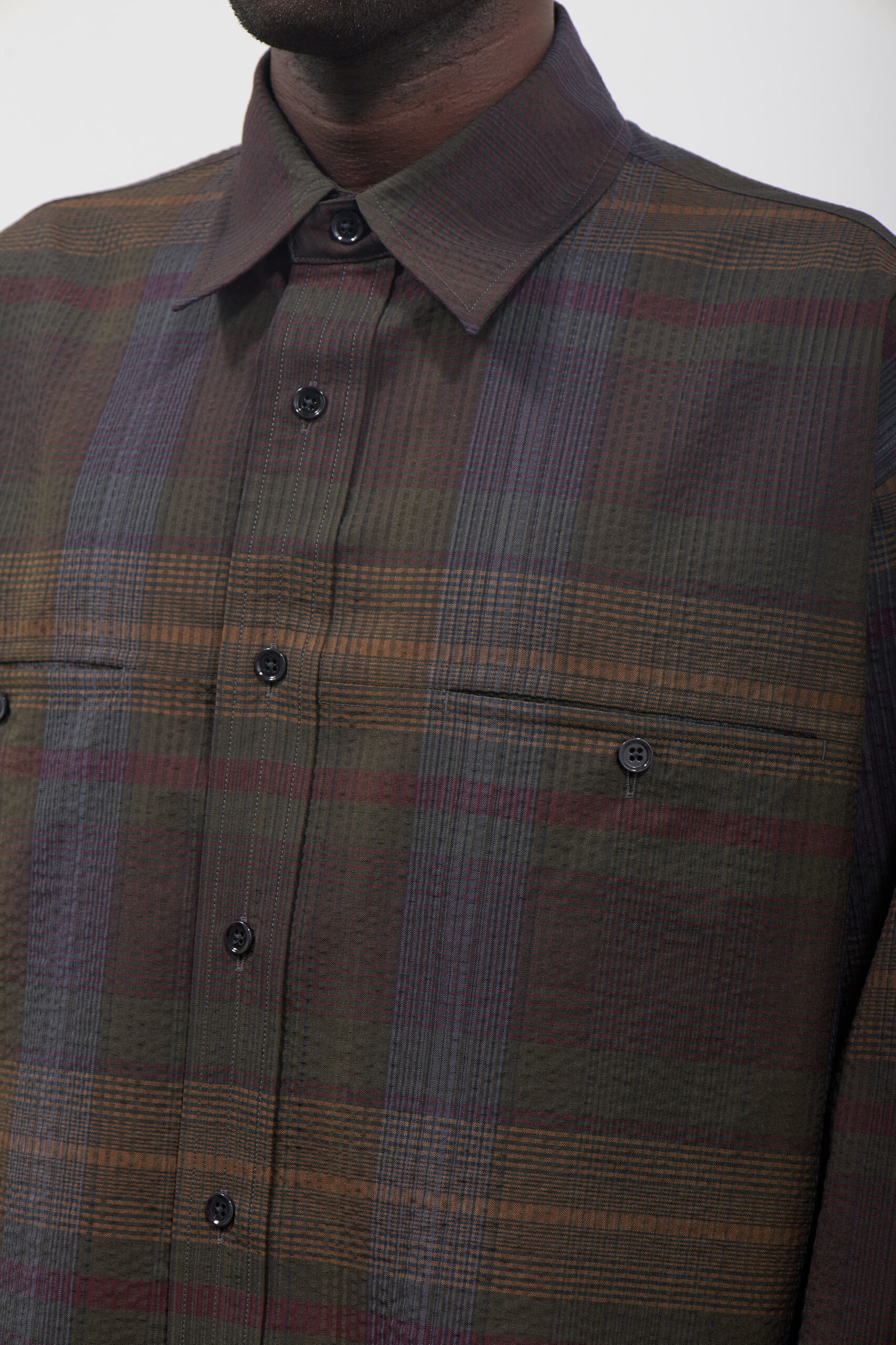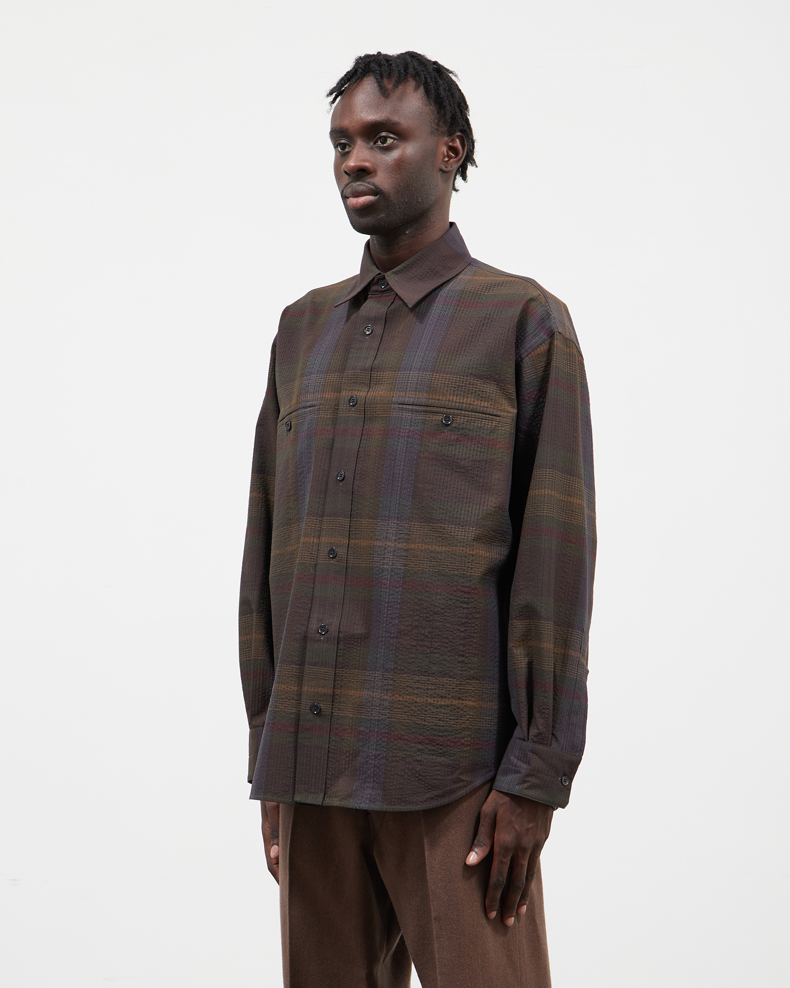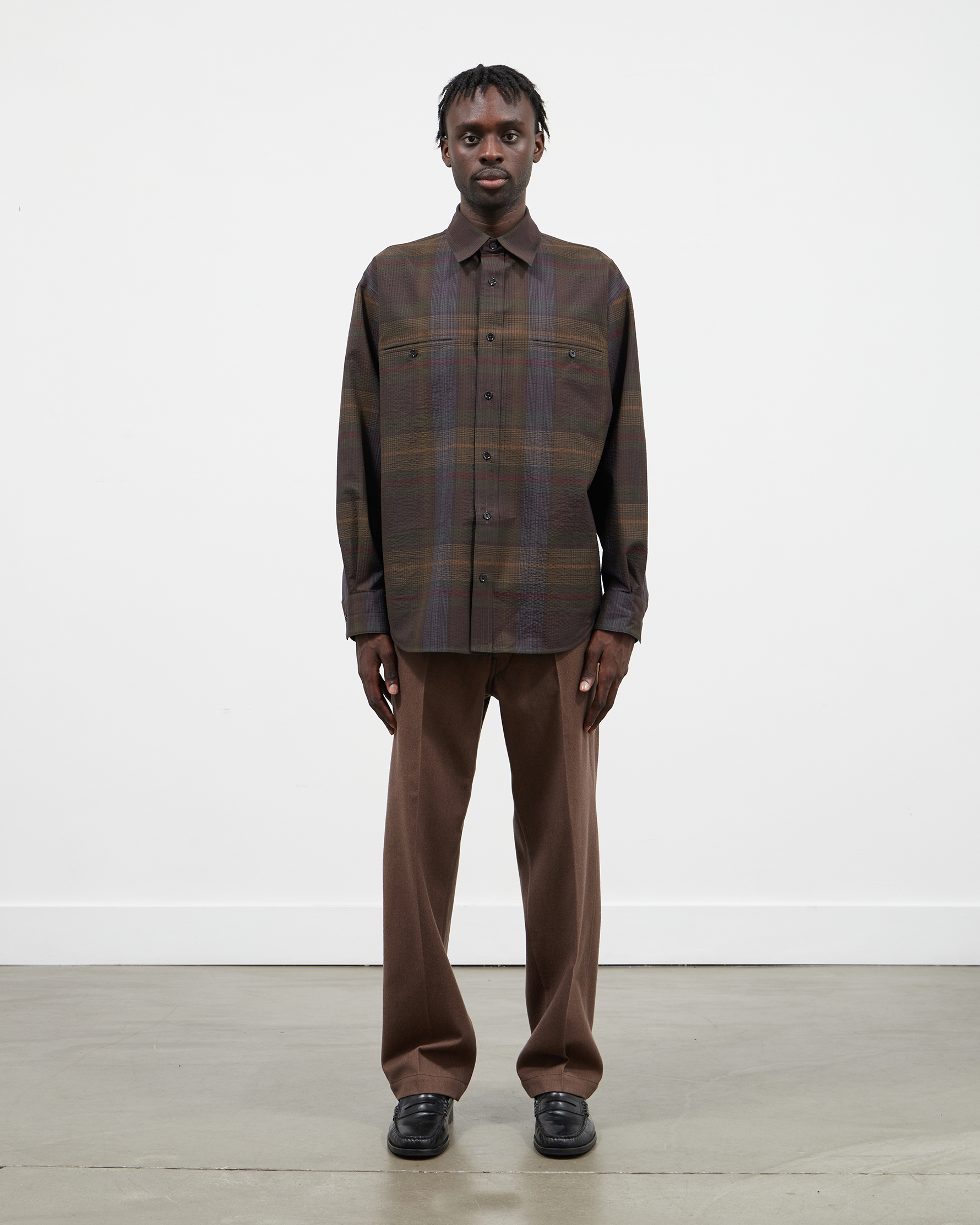 The Double Pocket Overshirt in Khaki/Burgundy is a long sleeve shirt from Lemaire. Produced from a beautiful wool seersucker with a subtle check, it has two chest button welt pockets, spread collar, slightly curved hem and a boxy cut. Crafted from 100% wool. Manufactured in Italy.