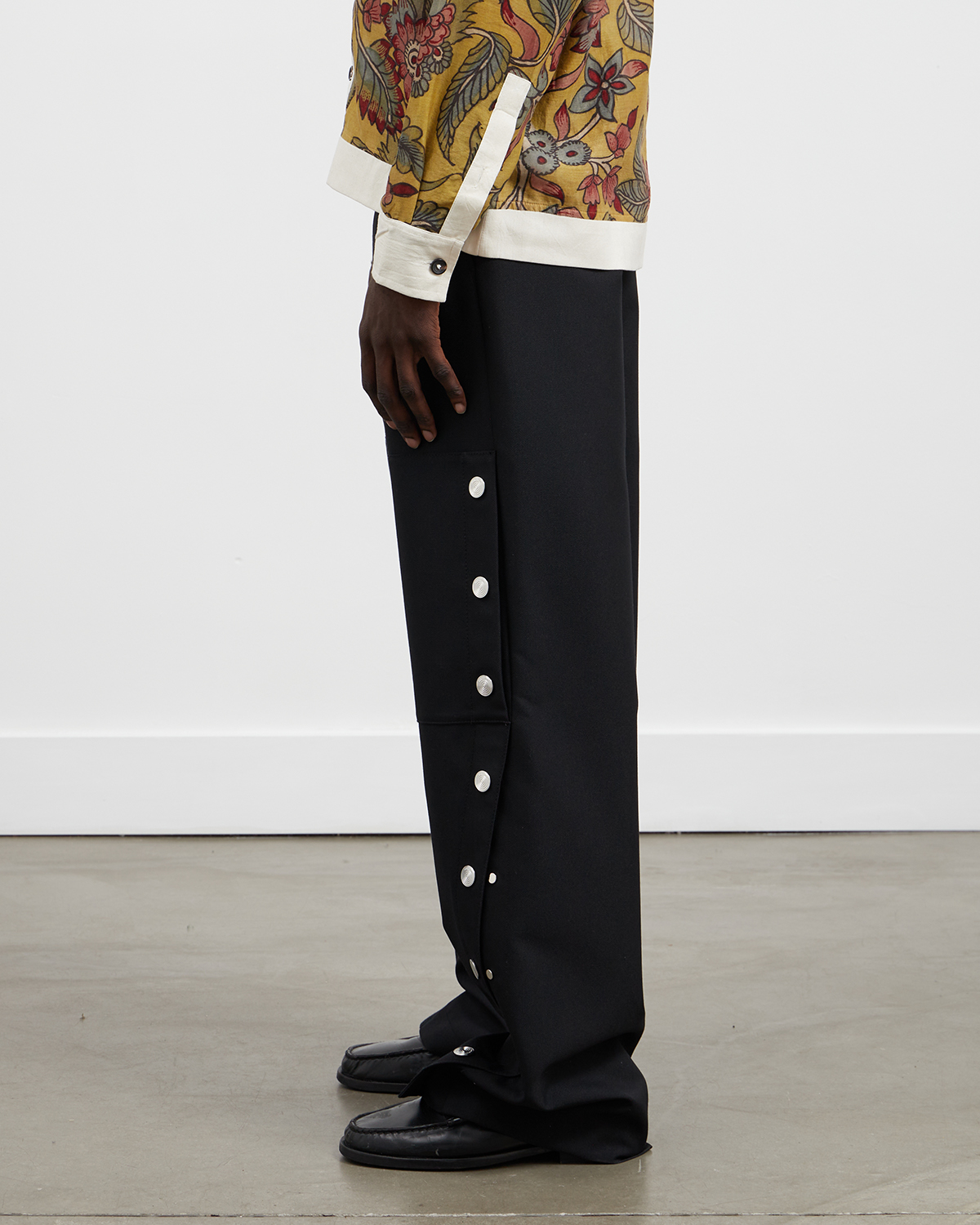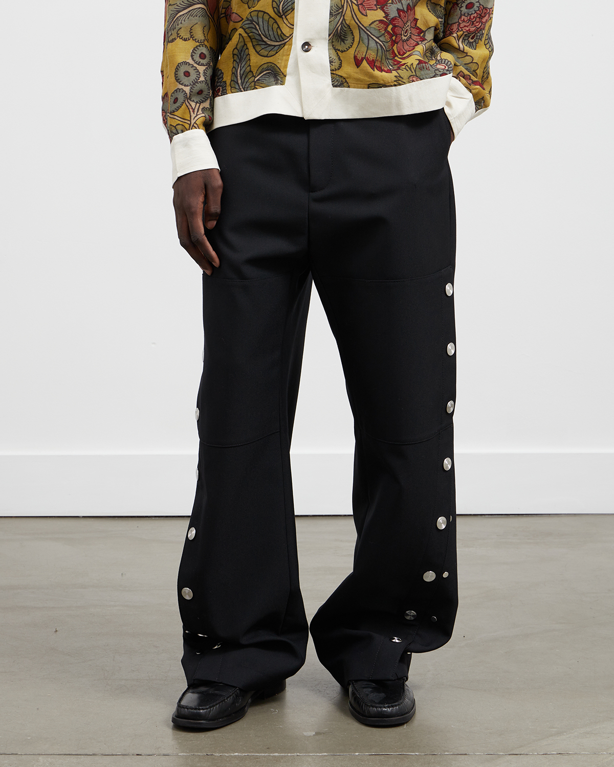 The Carisbrooke Trouser from Namacheko is one of the brands standout seasonal pieces. Crafted from a wool and polyester blend, the tailored pant features custom developed Namacheko trio rivets that follow the offset side seam to the front hem of the bodice, allowing the wearer to alter the width of the leg. The trousers also feature reinforced knees, side pockets, single rear flap pocket and custom button at fly. Crafted from 53% wool, 47% polyester. Manufactured in Romania.